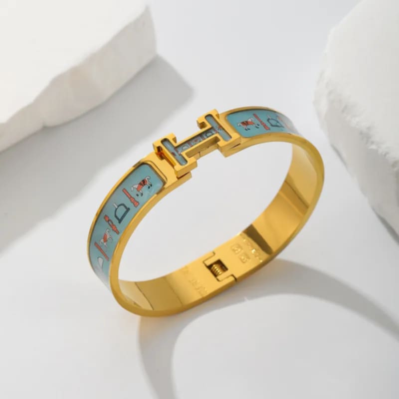 Armreif mit Symbolen & H“ – Hellblau vergoldet